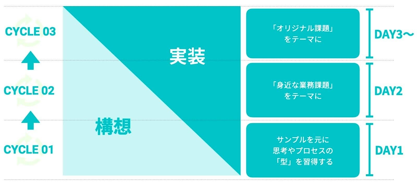 課題設定からデジタルを活用した解決策の構想まで行い、習得する思考の型やベーススキルは業務で活用可能。