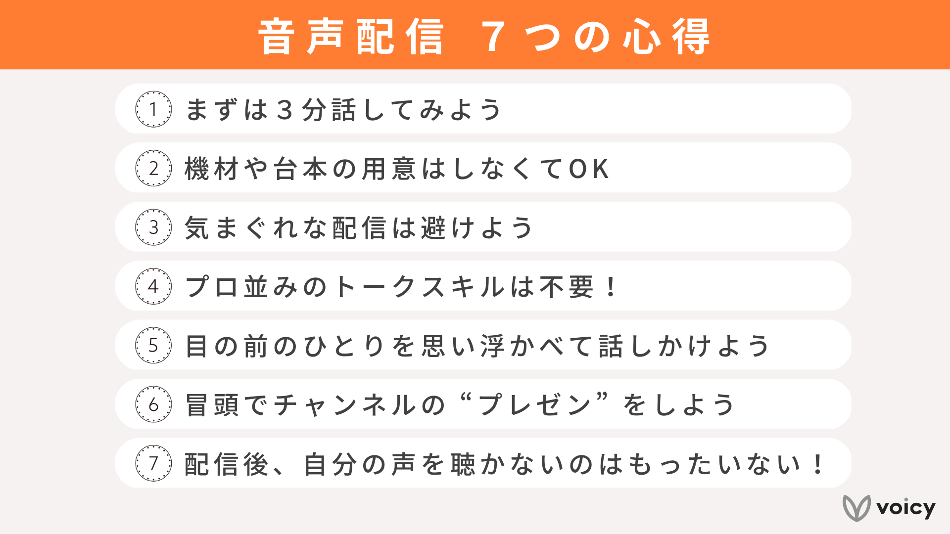 当たり前を継続することがゴールへの近道であることは、音声配信でも言えることです。ただ、発信活動における目的や目標は人によって異なるため、この“音声配信 7つの心得”を参考に、目的にあわせて自分に合ったやり方を見つけてみてください。