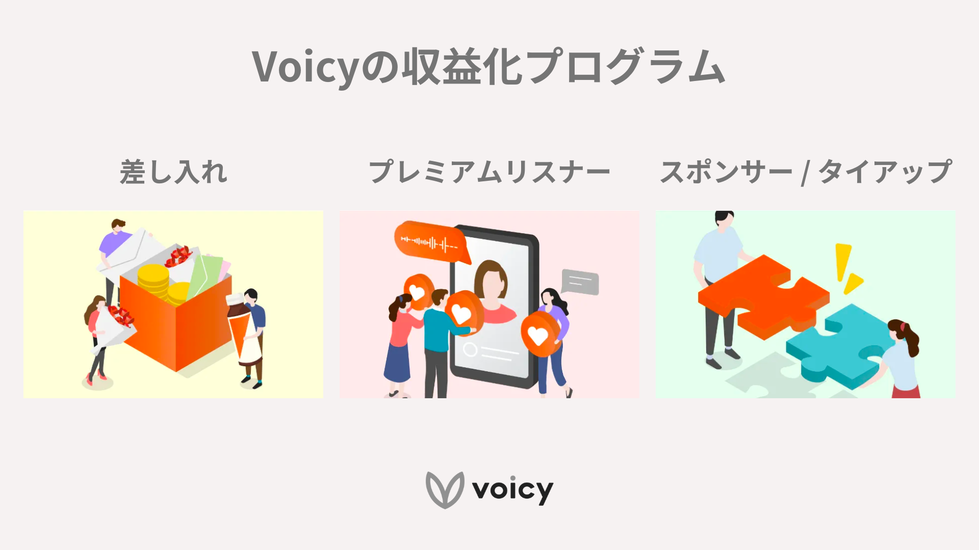 人気のチャンネルや熱量の高いコミュニティに、企業がスポンサーとして応援してくれる事例が増えています。パーソナリティにとって最も良い形になるよう、企業との交渉・契約をVoicyが調整します。いつも通りの放送にスポンサーコールを付け加えるものや、タイアップ企画としてのトークテーマ放送や対談などのいくつかの種類があります。