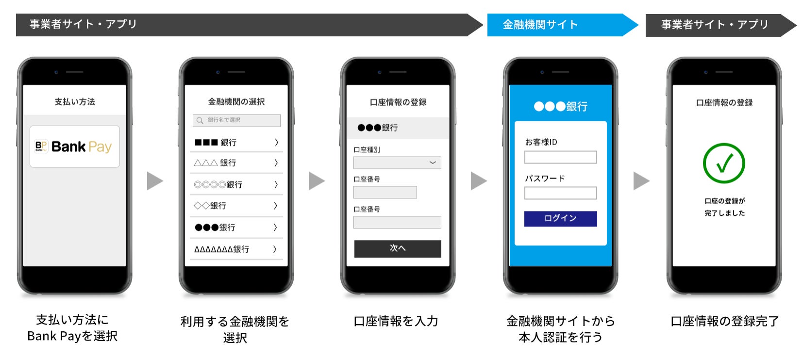 「Bank Pay」は、ユーザーが事前に登録した金融機関の口座から直接かつ即時に支払いやチャージが行える決済サービスで、三井住友銀行、みずほ銀行、三菱UFJ銀行、りそな銀行等の都市銀行から地方銀行、信用組合まで「Bank Pay」と提携する全国の金融機関*1で利用できます。ユーザーはECサイトやアプリなどの支払いやチャージに際し、初回手続時に金融機関口座を登録しておけば、2回目以降は登録口座の選択のみで即時引き落としによる決済が行われます。金融機関口座は利用するサービス毎に登録するため、利用用途に合わせた口座の使い分けも可能です。「Bank Pay」は、購入するたびに支払いを行う都度課金に加え、定期購入やサブスクリプションサービス*2といった、利用者に定期的に課金する継続課金にも対応しています。