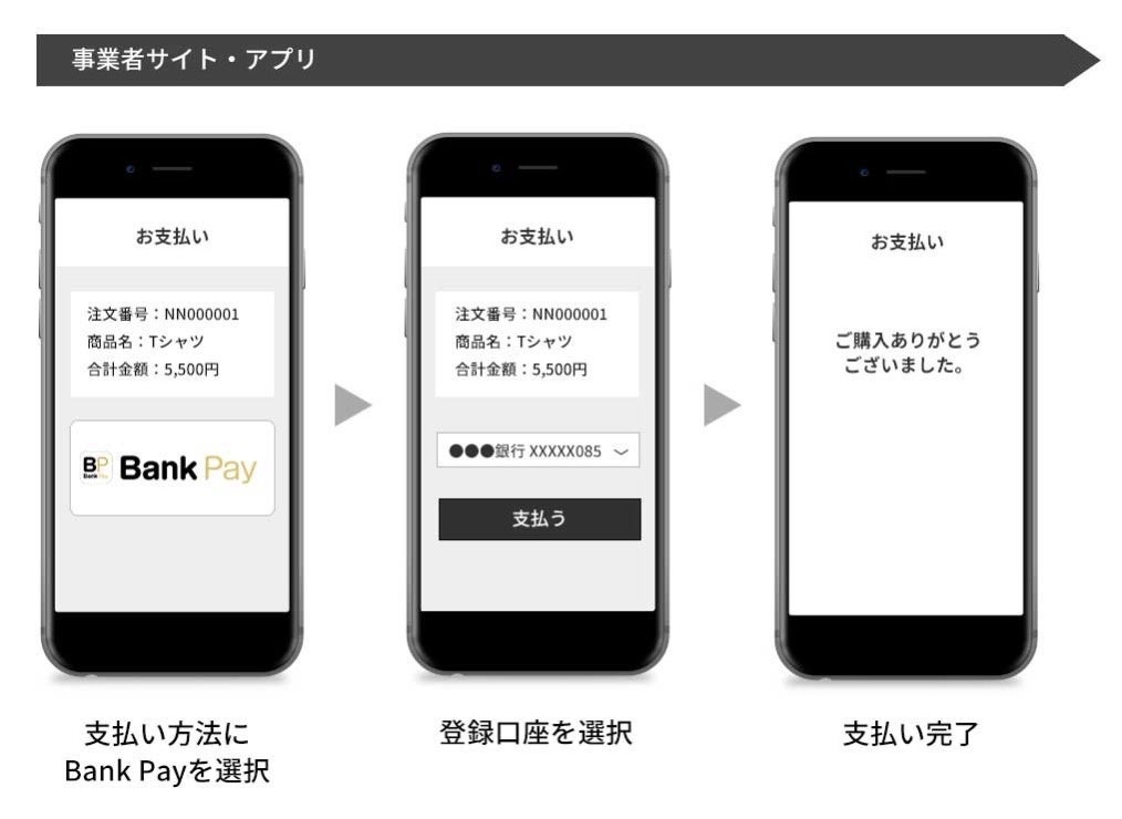 EC・アプリ事業者は本サービスの導入により、98%*3と保有率の高い金融機関口座を利用する消費者層を新規顧客として獲得できるほか、ユーザーに口座情報の都度入力が不要なシンプルな決済プロセスを提供することで、決済画面での離脱防止やリピート率の向上が見込めます。「Bank Pay」は、ECサイトやオンラインサービス、アプリでの決済に加え、事業者のハウス電子マネーや独自Payへのチャージにも活用が可能です。