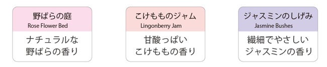 上から時計回りに こけもものジャム、野ばらの庭、ジャスミンのしげみ