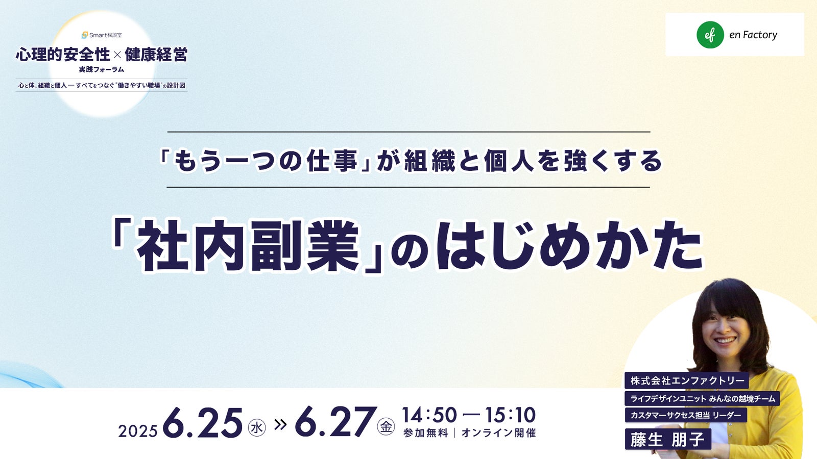 株式会社エンファクトリー(東京都千代田区、代表取締役社長CEO加藤健太)は、2025年6月25日(水)~6月27日(金)14:50〜15:10に、株式会社Smart相談室(東京都港区、代表取締役・CEO藤田 康男)主催『心理的安全性 × 健康経営 実践フォーラム心と体、組織と個人─すべてをつなぐ"働きやすい職場"の設計図』セミナーに登壇します(詳細はこちら:https://form.otsunagi.co/safetyxhealth2025?utm_source=mailmagazine&utm_medium=email&utm_campaign=enfactory)