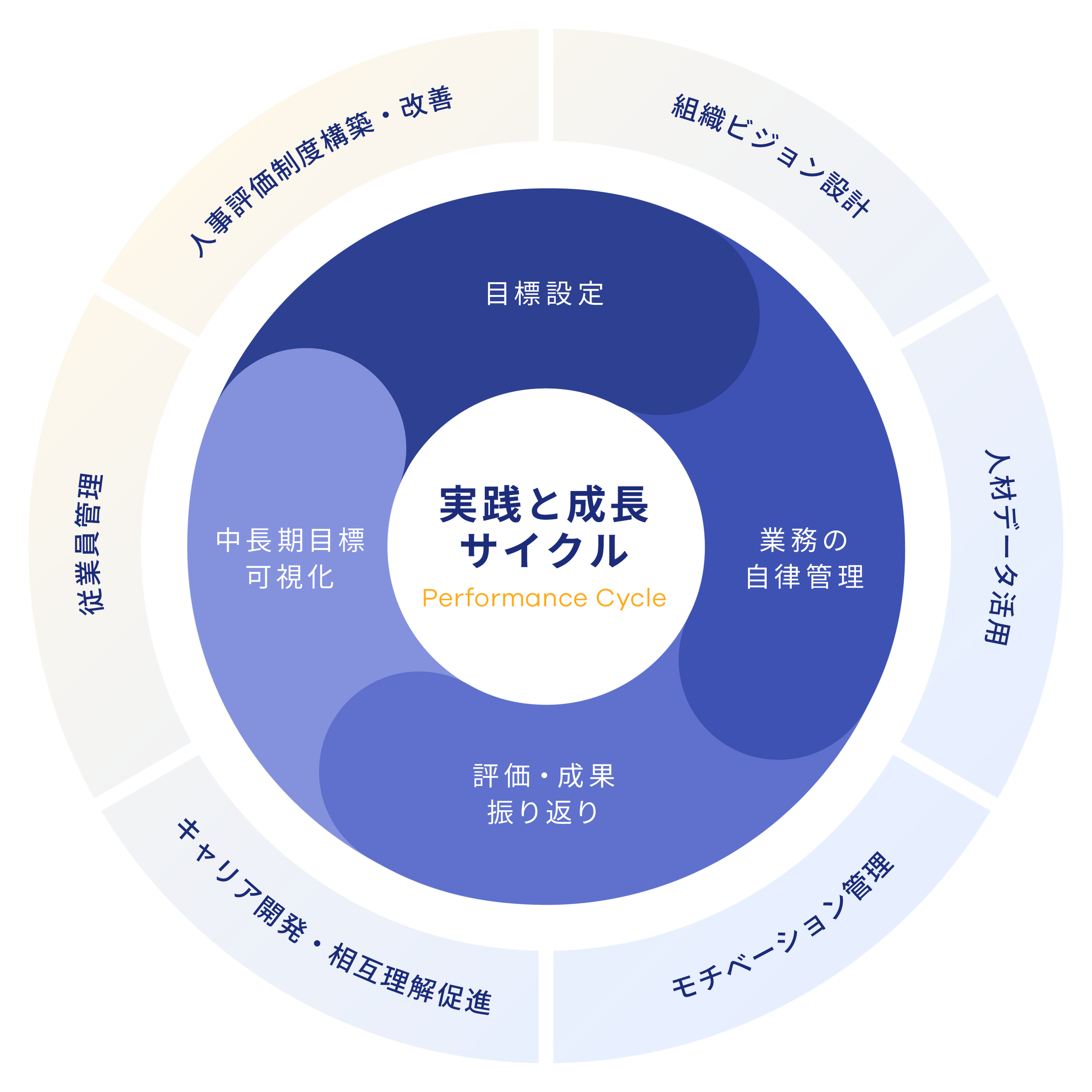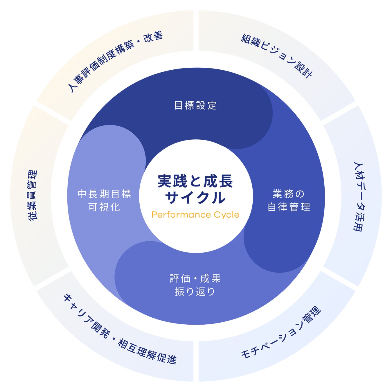 個々の成長を促し、組織の成果を最大化するパフォーマンスマネジメントを、クラウドシステムとコンサルティングの2軸で実現。トップダウンの画一的な管理から、従業員が自律的に能力を発揮できる組織への変革を支援します。