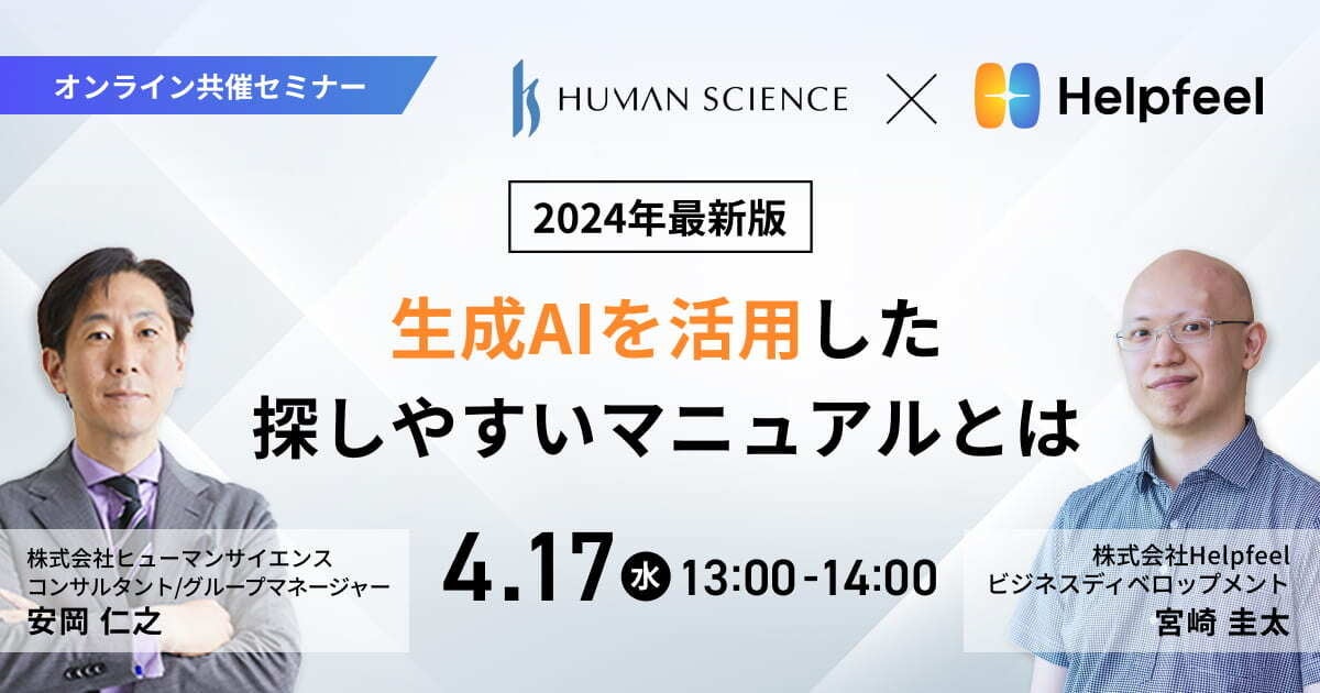 株式会社Helpfeel(京都府京都市、代表取締役/CEO:洛西 一周、以下 当社)は、2024年4月17日(水)に株式会社ヒューマンサイエンス(東京都新宿区、代表取締役:熊澤 剛、以下 ヒューマンサイエンス)とオンラインセミナー「2024年最新版 〜生成AIを活用した探しやすいマニュアルとは〜」を共催することをお知らせいたします。
