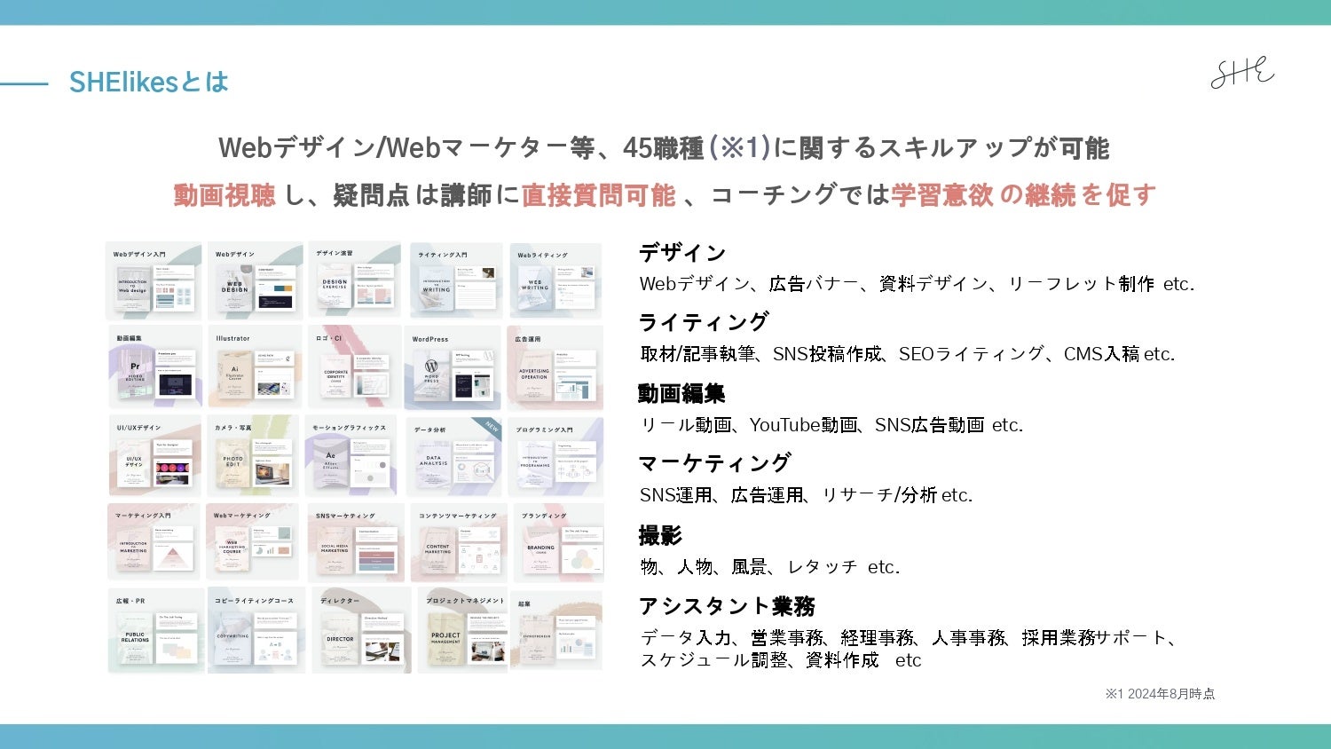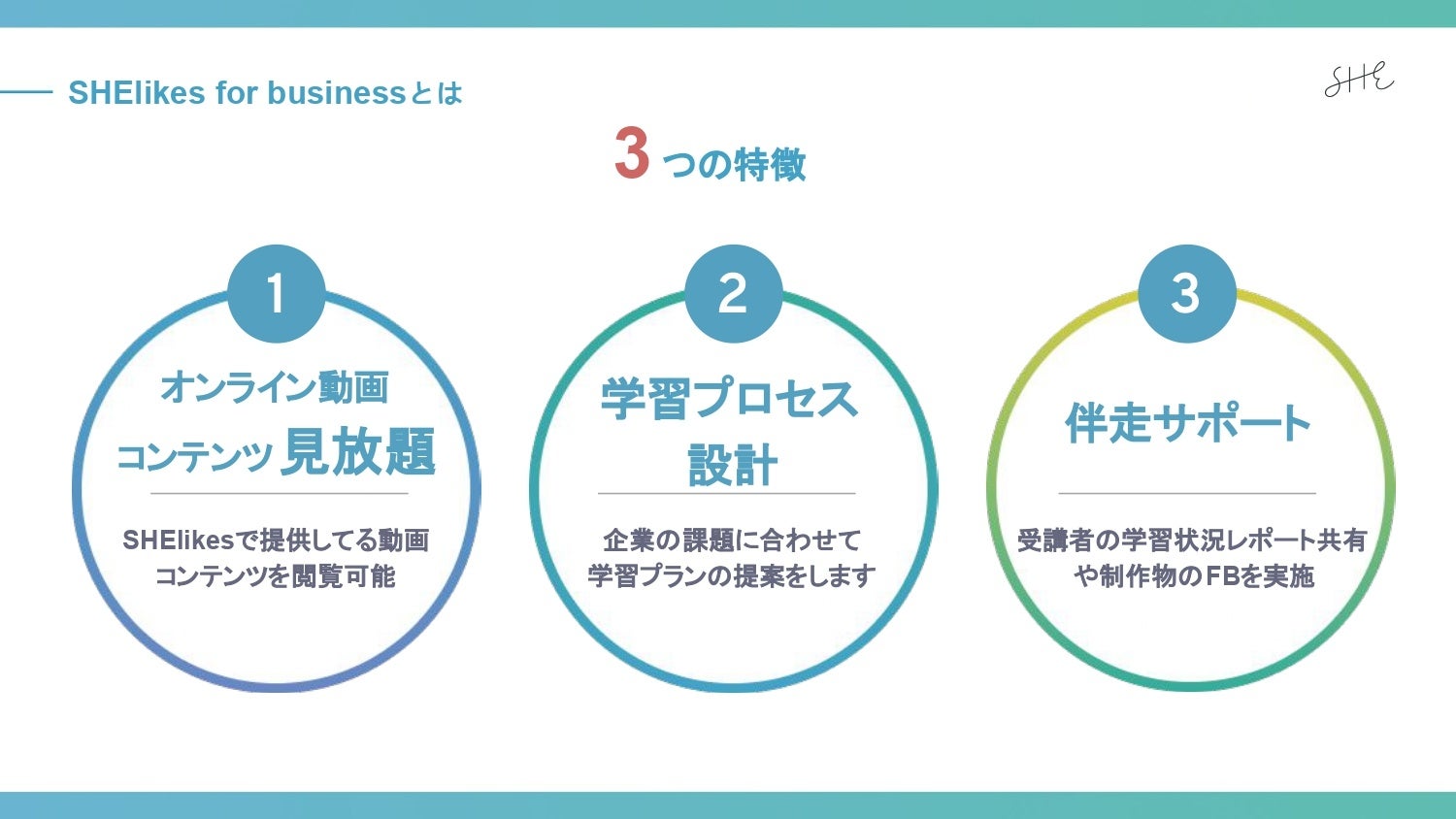 SHE、最大60%の助成で導入できる法人向けリスキリングサービス「SHElikes for Business クリエイティブ人材養成プラン」の提供を開始