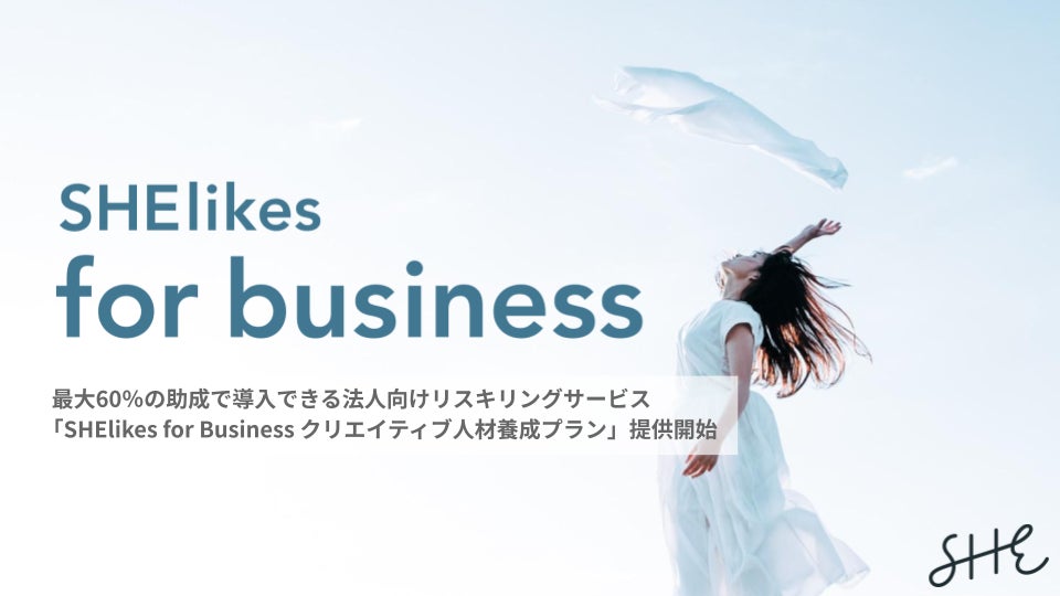 学ぶから働くまでを支援する女性向けキャリアスクール「SHElikes(シーライクス)」を運営するSHE株式会社(所在地:東京都港区、代表取締役 CEO/CCO:福田恵里、以下SHE)は、厚生労働省の人材開発支援助成金を活用して最大60%(※)の助成で導入できる法人向けリスキリングサービス「SHElikes for Business クリエイティブ人材養成プラン」を提供開始します。