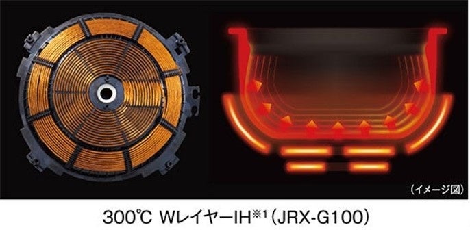 「300℃ WレイヤーIH※1」は、底面に2層IHコイル構造を採用。なべ底部分を包み込む発熱コイルの1層目は、釜全体に熱をシームレスに伝えます。また、2層構造にすることで、大火力および、土鍋を直火で炊くような炎の温度差を再現。