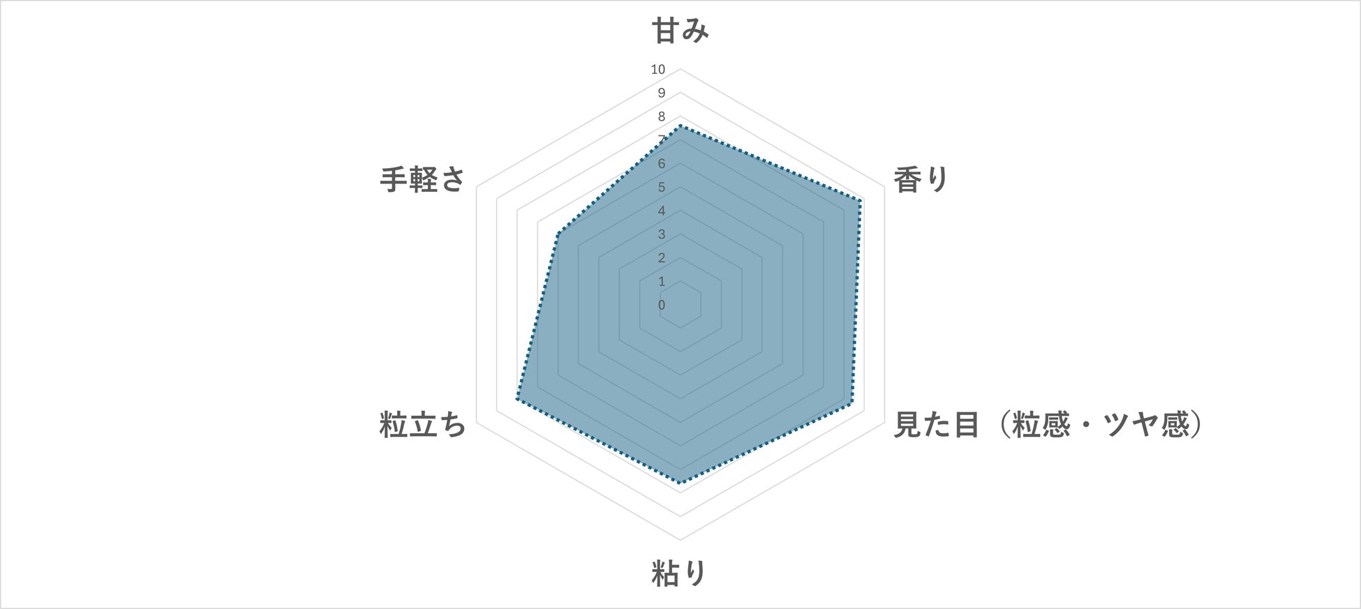 ー 甘み7.6点 香り8.8点 見た目(粒感・ツヤ感)8.4点 粘り7.6点 粒立ち8点 手軽さ6点