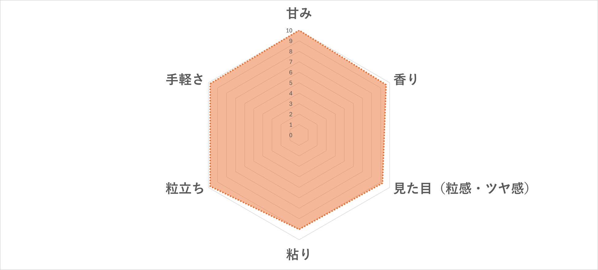 ー 甘み10点 香り9.6点 見た目(粒感・ツヤ感)9.2点 粘り9点 粒立ち9.8点 手軽さ9.8点