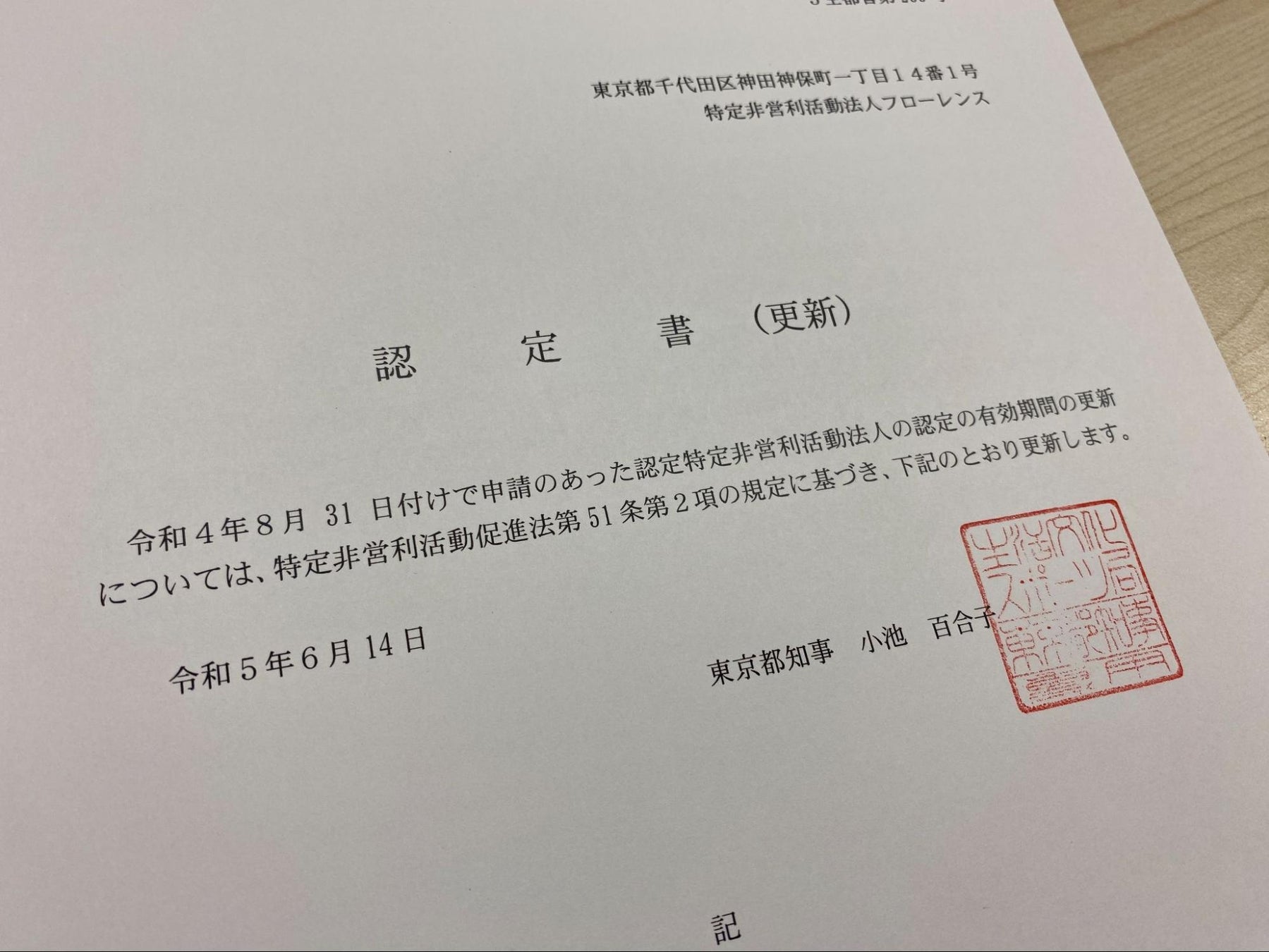 フローレンスは認定NPO法人としての認定後10年が経過し、今回2回目となる更新審査を経て、2023年夏に認定NPO法人を更新することができました。