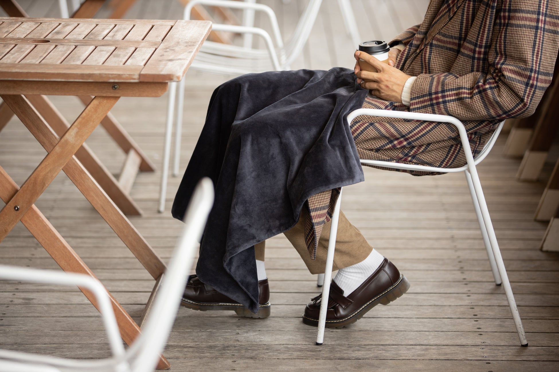 お腹を温める腰掛け、太ももをあたためる膝掛けブランケットとしてはもちろん、くるりと首元に巻いてボタンを留めれば肩掛けとして、背中をあたためることもできます。