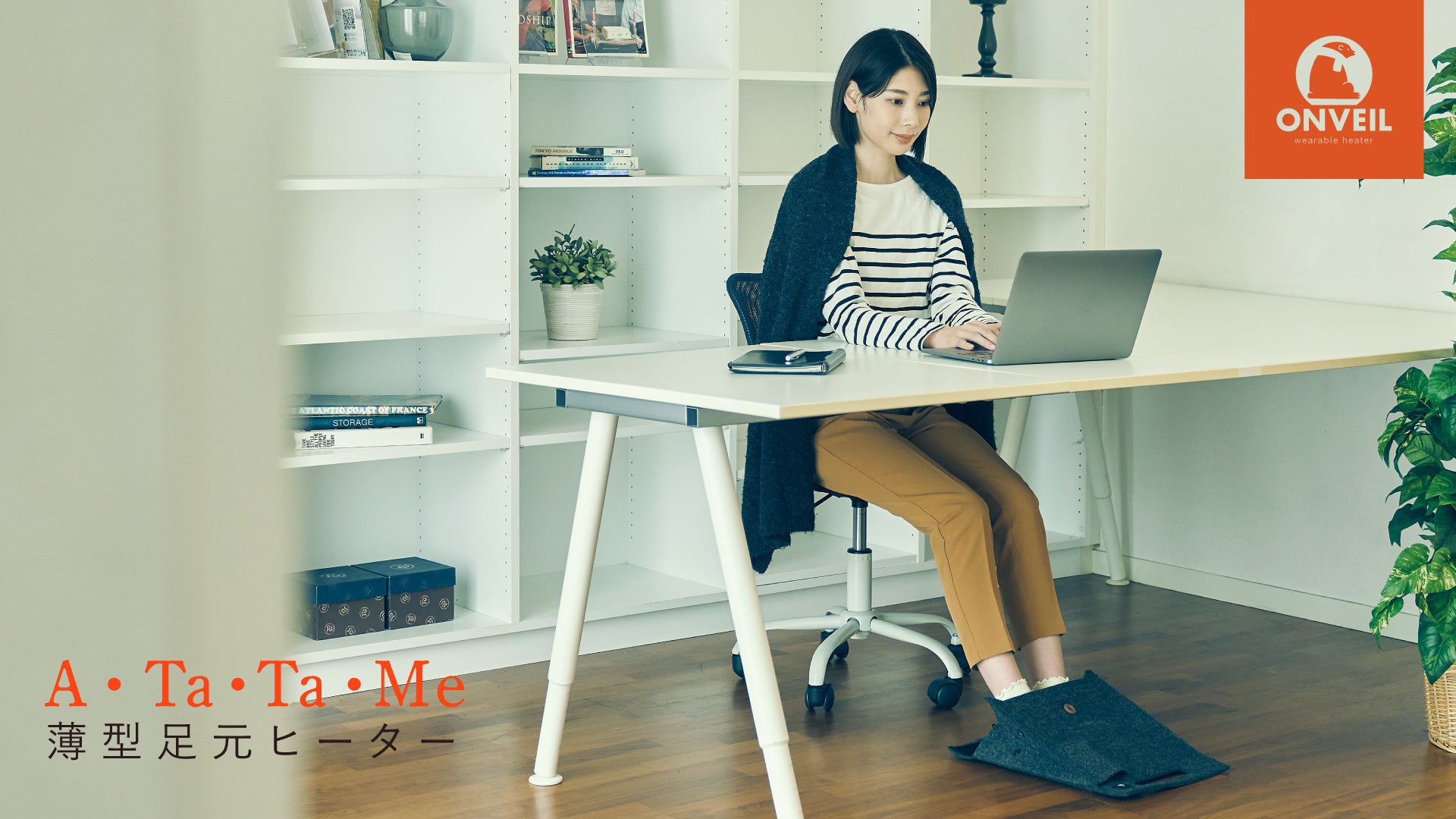 現在「ヒートベスト」「ヒートブランケット」をラインナップしており、今回発売する「ONVEIL薄型足元ヒーター A・Ta・Ta・Me」は足先をあたためるための薄型ヒーターです。