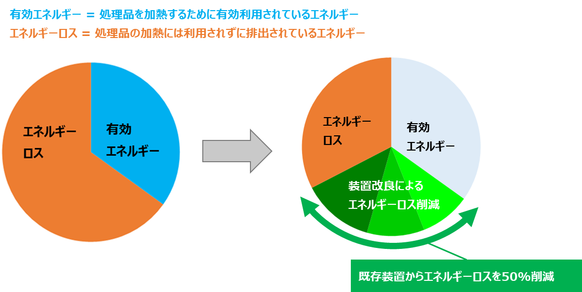 熱処理装置において、処理品を加熱するために有効利用されている電力は約30%、残り約70%は放散熱や処理品以外に使用され、エネルギーロスとなっております。このエネルギーロスの半減に向けて、さまざまな装置改良を行い、カーボンニュートラル実現に向けた取り組みを紹介いたします。