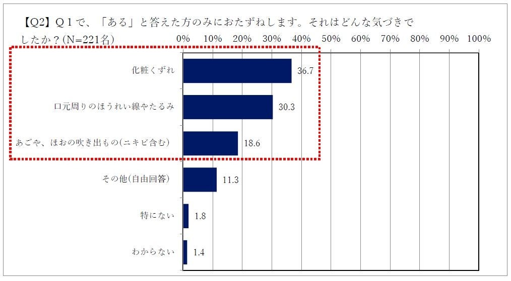 マスクを外してヒヤリ、ハッとしたのは「化粧くずれ」36.7%、「口元周りのほうれい線やたるみ」は30.3%!