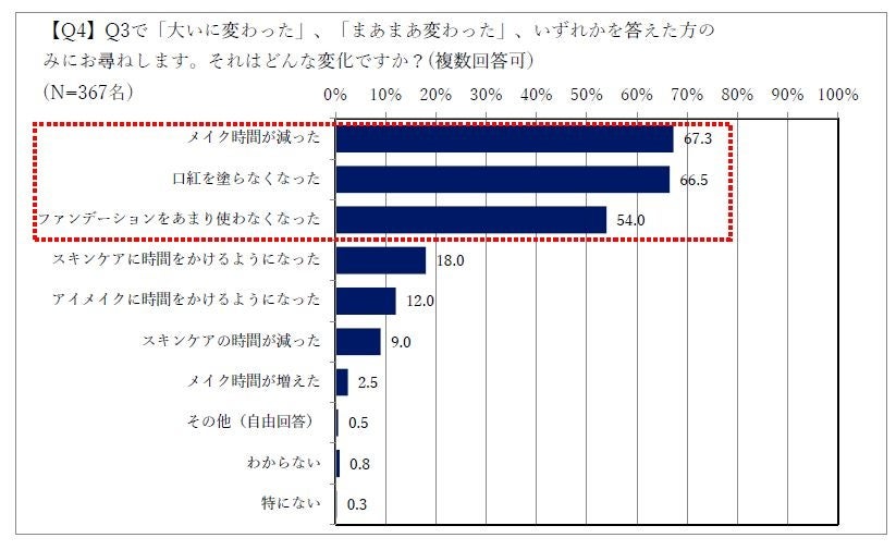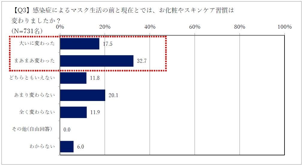 - 質問3:感染症によるマスク生活の前と現在とでは、お化粧やスキンケア習慣は変わりましたか?