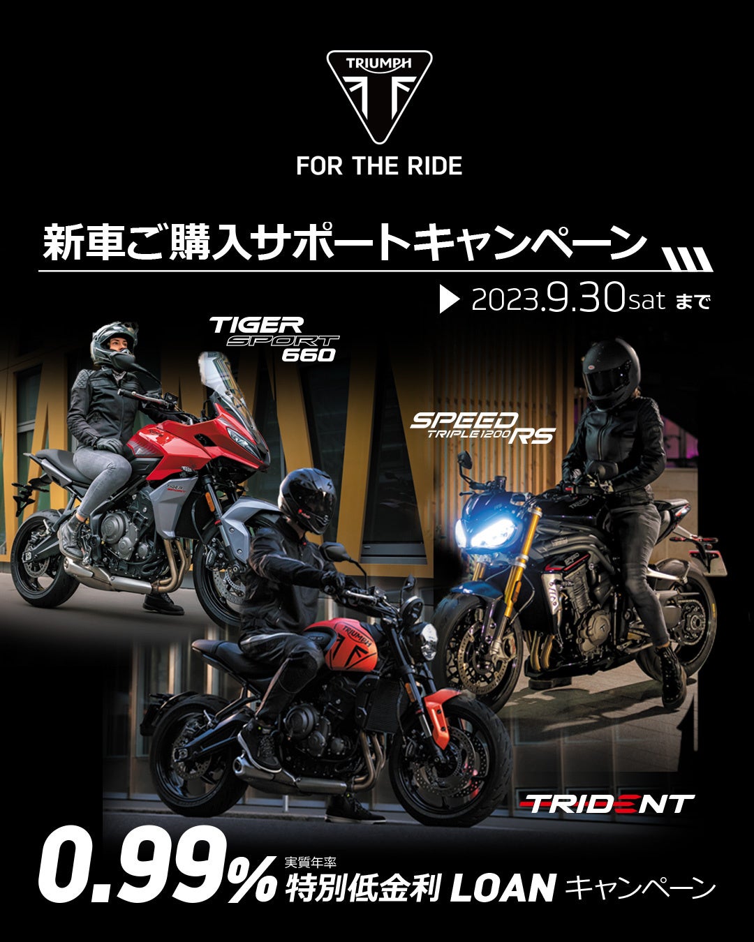 内容:キャンペーン期間中、全国のトライアンフ正規販売店にて対象車両をご成約、且つローン契約完了していただいたお客様に、「0.99% 特別低金利ローン」をご提供いたします。