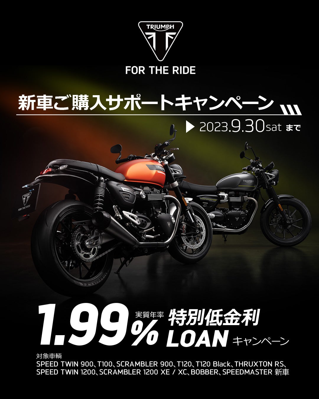 内容:キャンペーン期間中、全国のトライアンフ正規販売店にて対象車両をご成約、且つローン契約完了していただいたお客様に、「1.99% 特別低金利ローン」をご提供いたします。