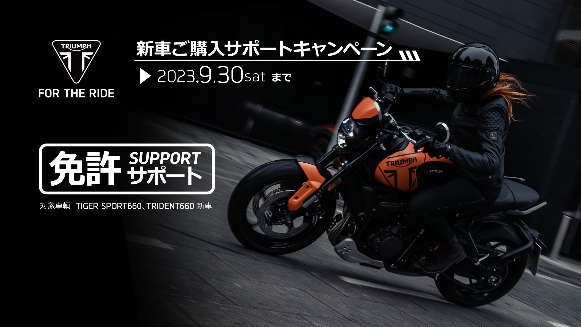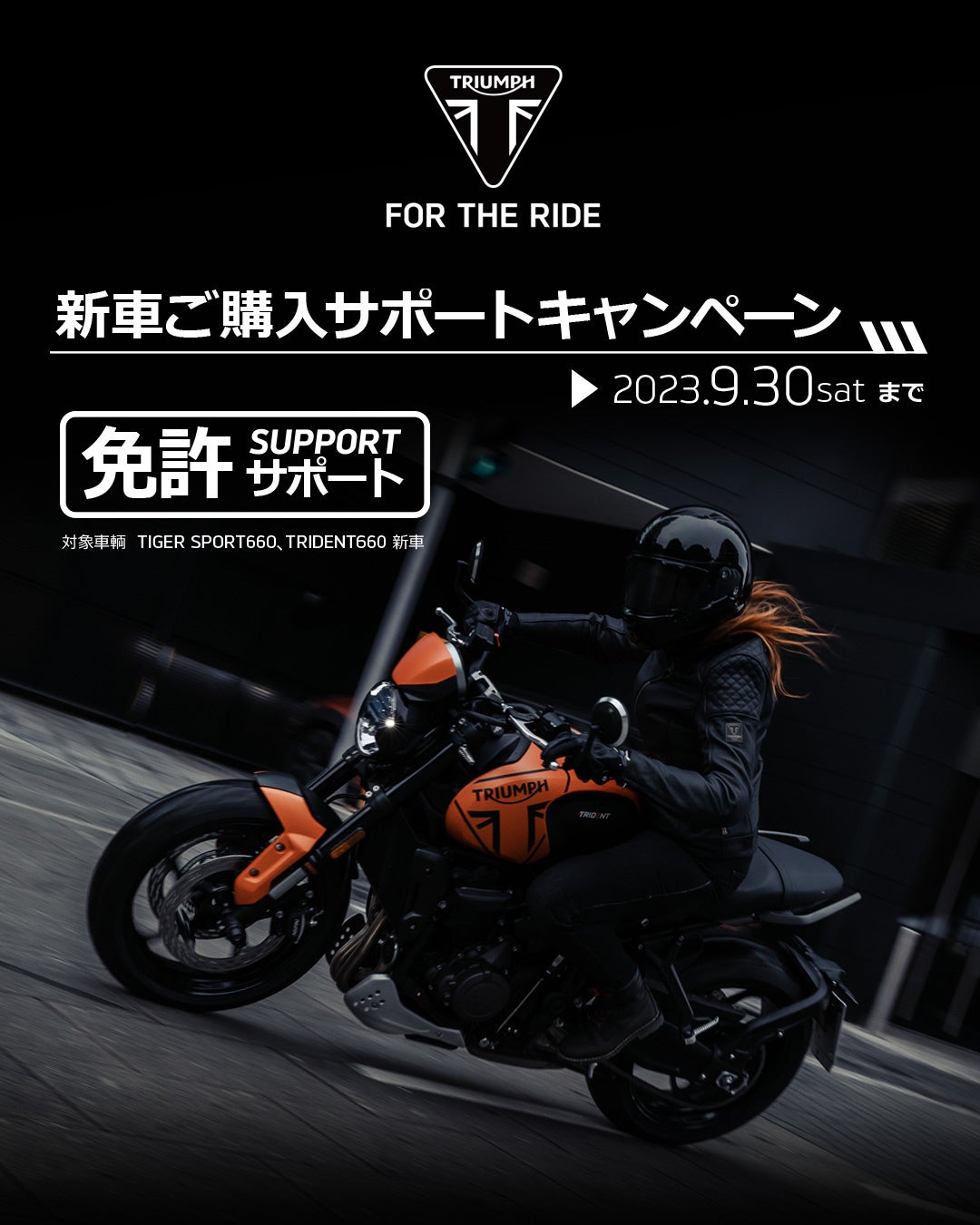 内容:キャンペーン期間中、全国のトライアンフ正規販売店にて対象車両をご成約・ご登録された方、且つ2023 年4月以降に大型自動二輪 MT 免許を取得された方、または 2023 年12月末までに取得される方を対象に、大型自動二輪MT 免許取得費用相当分として5万円(税別)をサポート