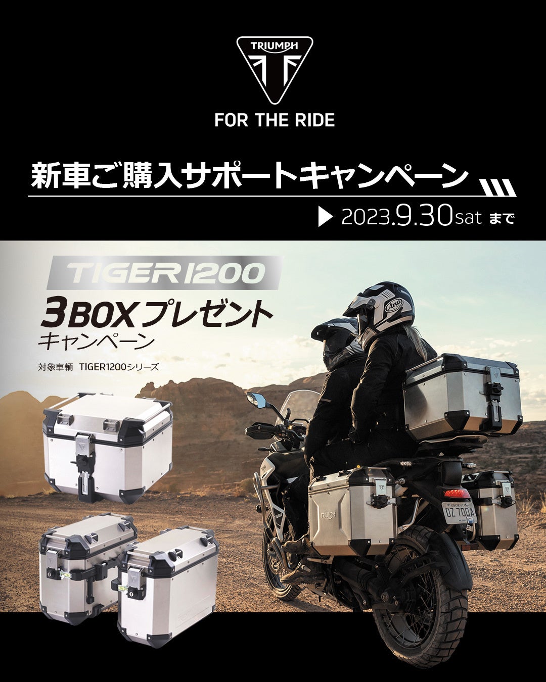 内容:キャンペーン期間中、全国のトライアンフ正規販売店にて対象車両をご成約していただいたお客様に、トップボックスとサイドパニアケースをプレゼント。