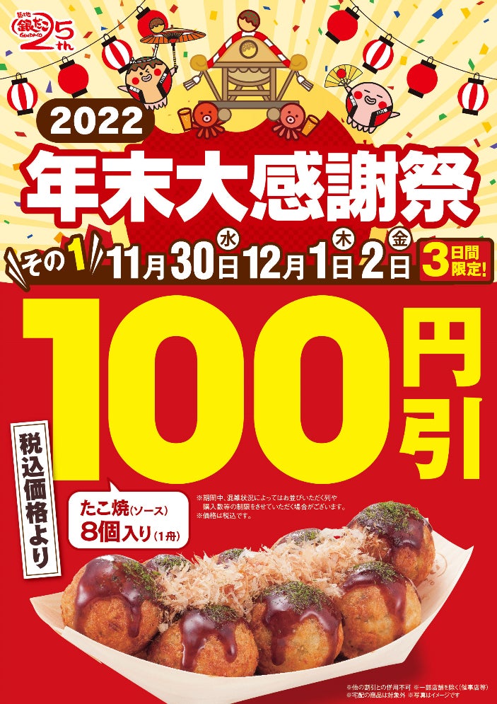 11月30日(水)、12月1日(木)、2日(金)の3日間は、築地銀だこ1番人気 “ぜったいうまい!!たこ焼(ソース・8個入り)” を、税込価格より 100円引きでご提供いたします!