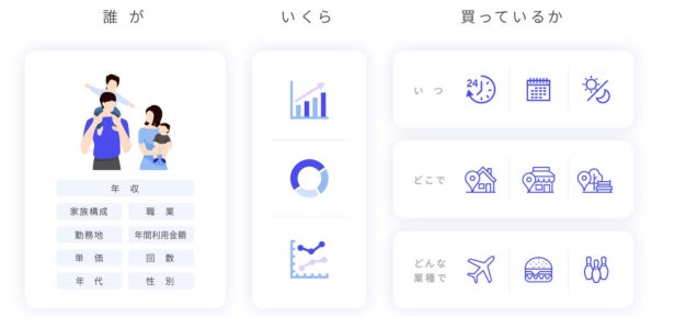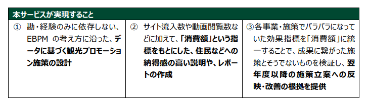 本サービスは、行政・自治体が観光振興を目指す際に、①キャッシュレスデータを用いて観光消費を分析し、その結果を元にターゲティング ②送客および広告配信 ③送客および広告配信の結果を、観光消費額で効果検証するサービスです。