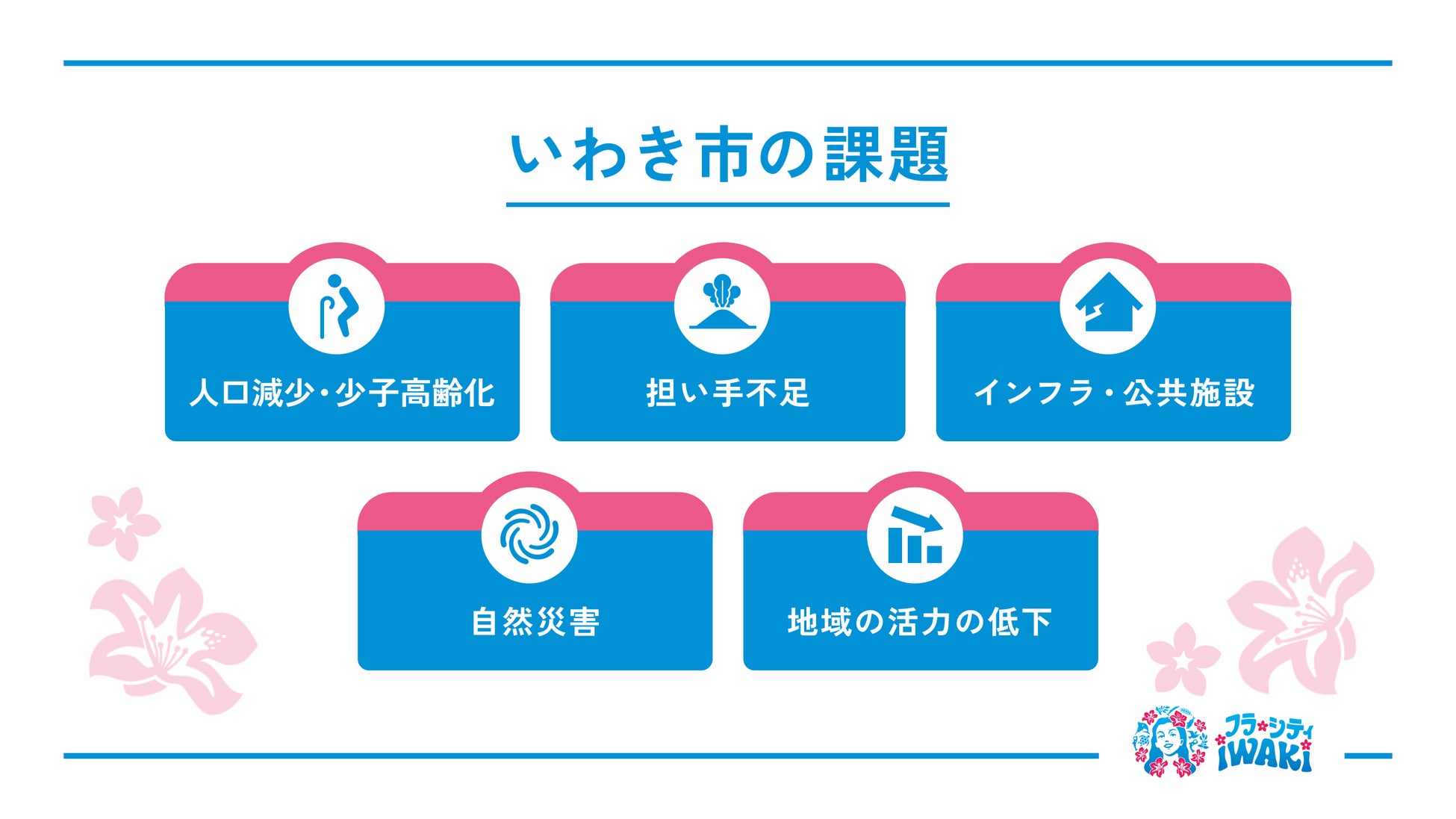 いわき市では、市民一人ひとりが生き生きと暮らし、「誰もが住んでよかった、住み続けたいと思えるまち」の実現に向けて、Well-Being(幸福度の高い)なまちづくりを進めています。