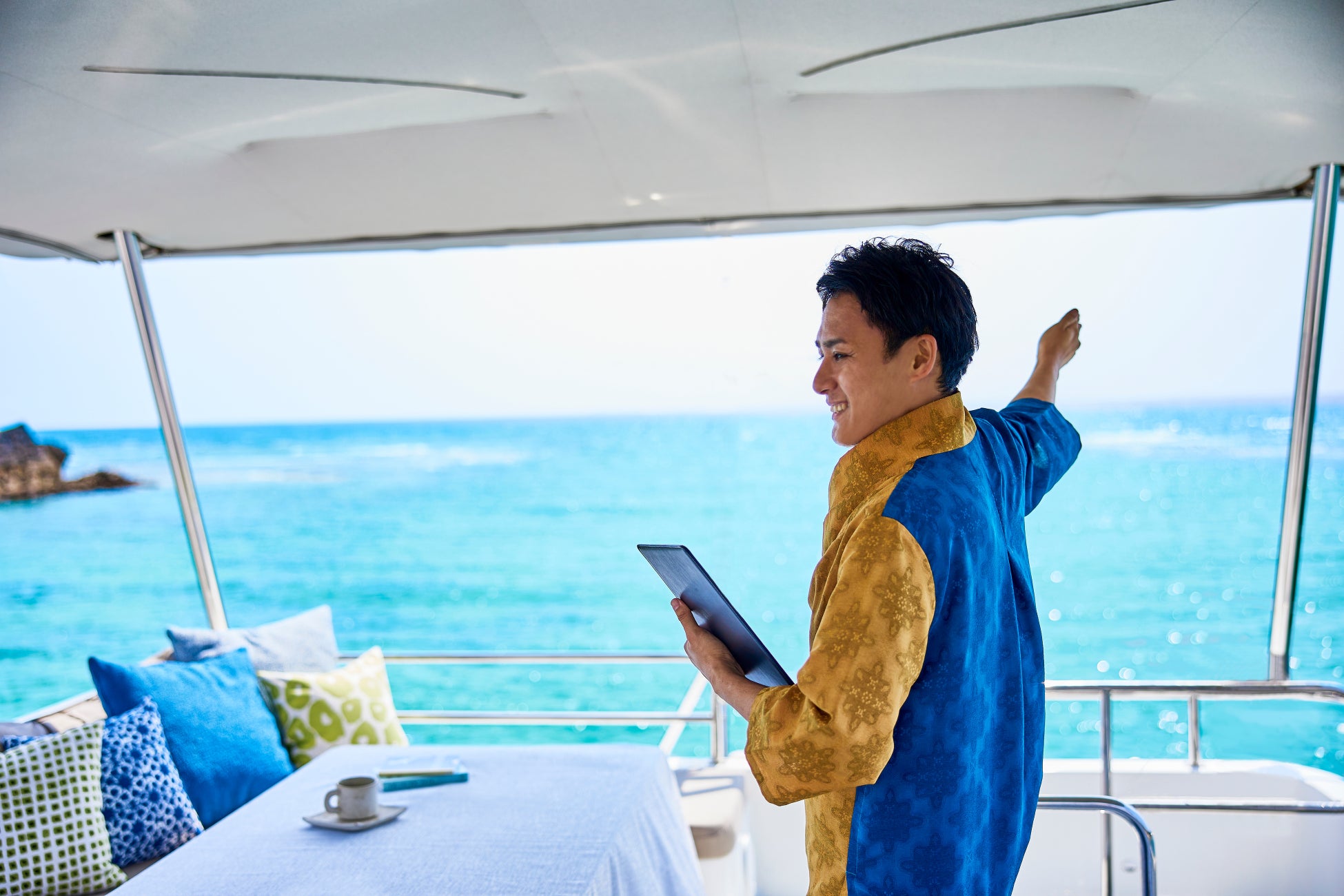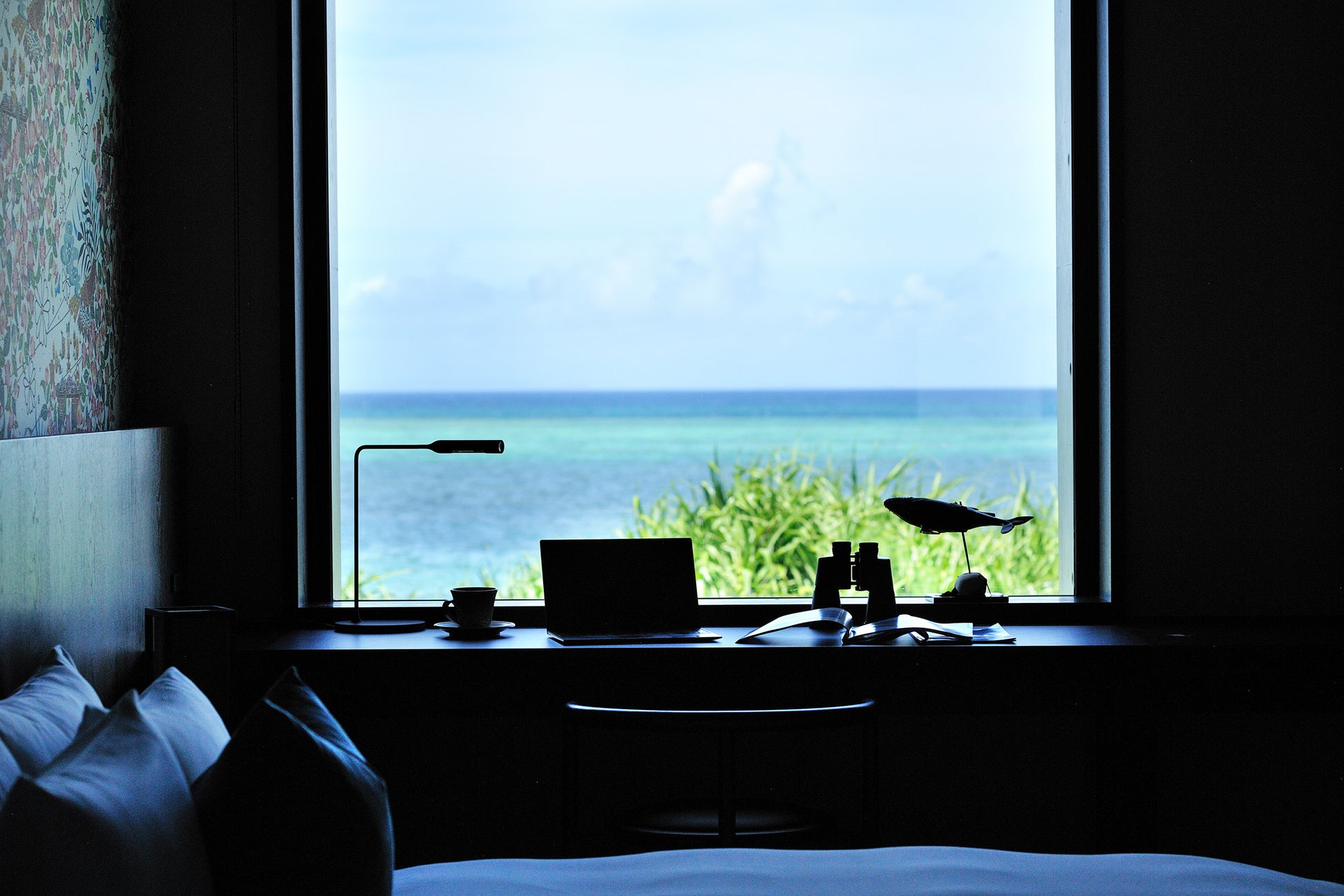滞在中は客室に双眼鏡やクジラに関する書物を用意します。星のや沖縄は施設全体が西海岸に面しており、様々な場所でクジラを見ることができます。海に臨む客室やプールサイド、星のや沖縄に隣接する「星野リゾート バンタカフェ」は絶好の場所です。客室で穏やかな海を眺めながらクジラの姿を探したり、乗船中に撮影した写真を見返したり、ゆっくりと流れる時間を過ごします。