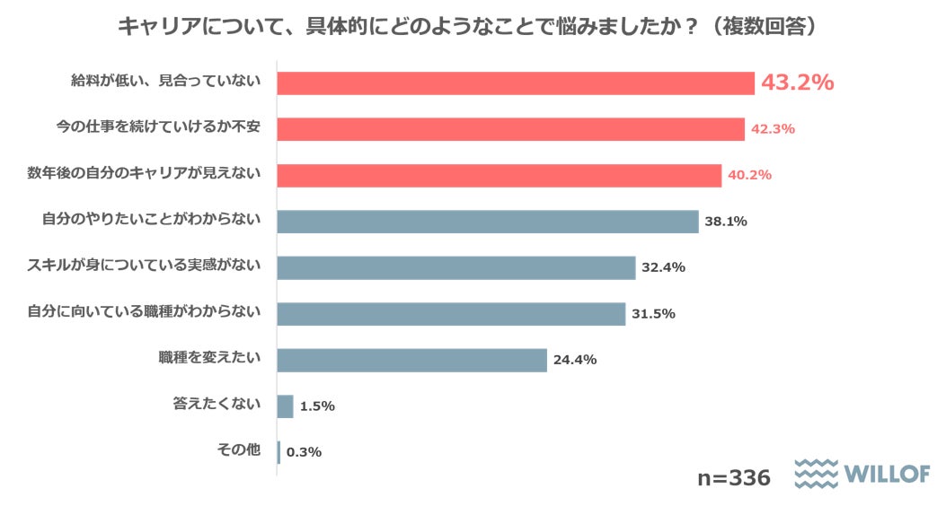 また、【自分のキャリアについて悩んだ経験がある】と回答した人に対し、【具体的にどのような内容で悩んだか(複数回答)】について聞いたところ、「給料が低い、見合ってない」が43.2%で最も高い結果となりました。次いで「今の仕事を続けていけるか不安」が42.3%、「数年後の自分のキャリアが見えない」が40.2%という結果になりました。]