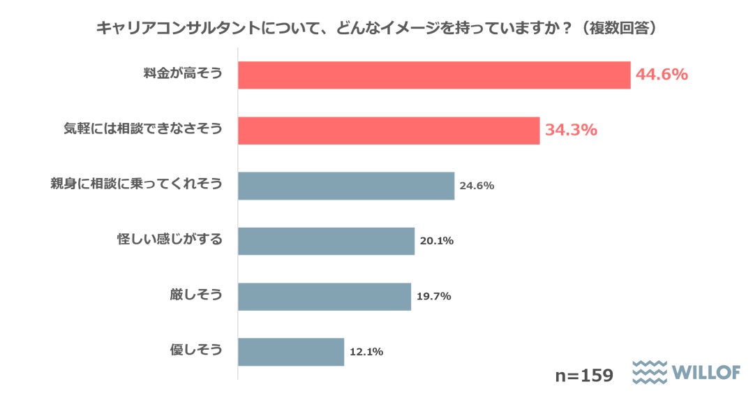また、【キャリアコンサルタントについてどのようなイメージを持っているか】について聞いたところ、「料金が高そう」が44.6%で最も多い結果となりました。次いで「気軽には相談できなさそう」が34.3%、「親身に相談に乗ってくれそう」が24.6%という結果になりました。キャリアコンサルタントのサービスに関してあまり知られていないこともあり、相談するハードルが高いと感じている人が多いようです。