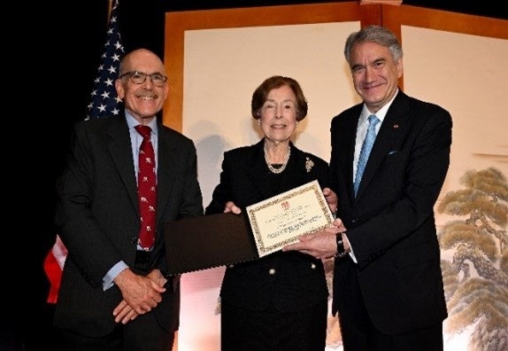 10月10日、同協会はワシントンDCの由緒あるオムニ・ショーラム・ホテルにて第39回US-Japan Capital Galaを開催し、同氏に2025年のマーシャル・グリーン賞を授与しました。本賞は、米国の著名な外交官であり、ワシントンDC日米協会の創設者であるマーシャル・グリーン氏の名前を冠する賞で、日米両国の交流や関係強化に多大な貢献をした人物*2に贈られるものです。授賞式では、カーラ・ヒルズ元米国通商代表部代表からマーシャル・グリーン賞が授与されました。