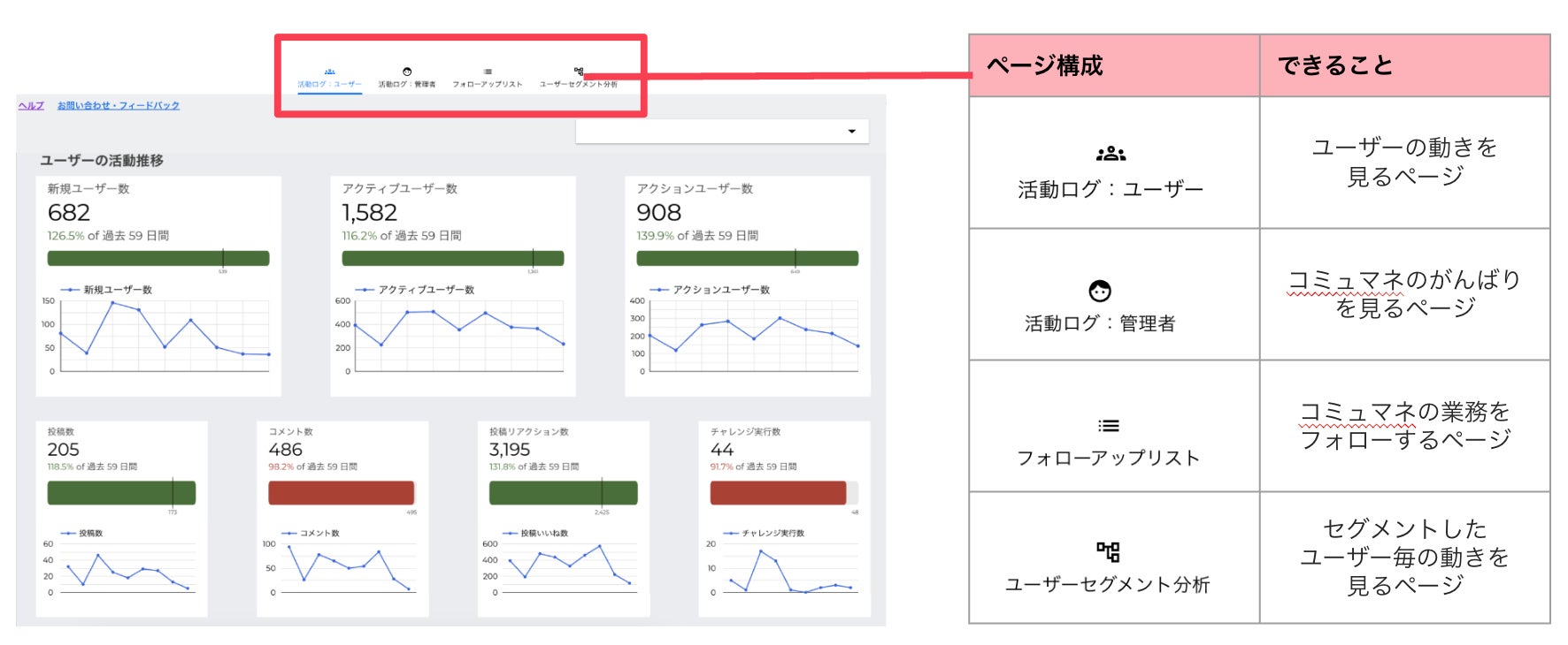 開発中のβ版機能をいち早く体験することができます。第一弾として、コミュニティ全体の状況や個別ユーザーの行動履歴の一元管理が可能となる「コミュニティエクスプローラー」の提供を開始しました。コミュニティの戦略的なアクションを検討する際にご活用いただけます。