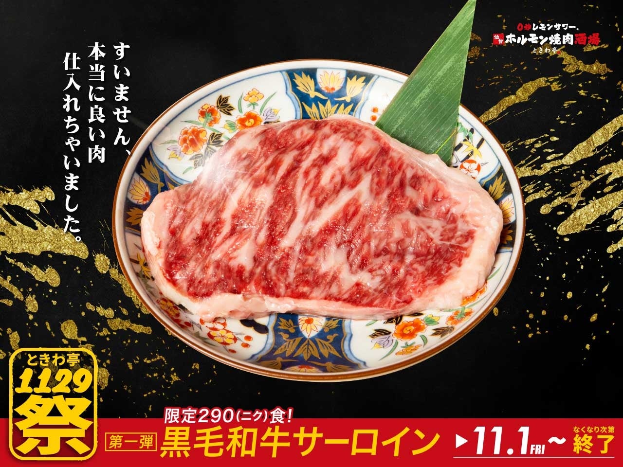 GOSSO株式会社(本社:東京都渋谷区、代表取締役:藤田建)は、「0秒レモンサワー®仙台ホルモン焼肉酒場 ときわ亭」(一部店舗を除く)で、11月29日(イイニク)の日にちなんで、『ときわ亭1129祭』キャンペーンを開催します。第1弾は、~すいません 本当に良い肉仕入れちゃいました~と題して、11月1日(金)より290(ニク)食限定で、「黒毛和牛サーロイン」を3,299円(税込)にて提供します。https://zero-tokiwa.com/