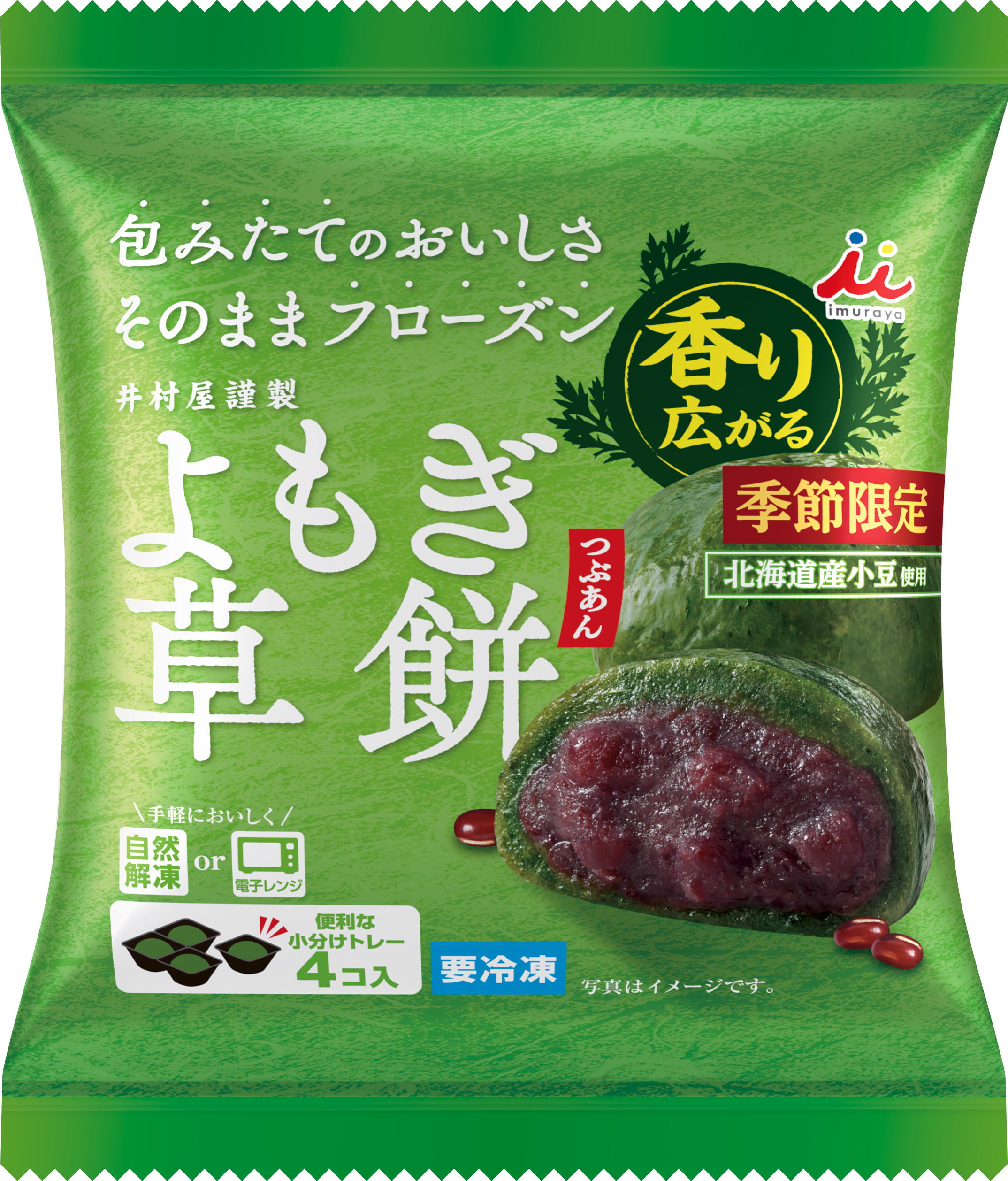 井村屋株式会社(本社:三重県津市高茶屋七丁目1番1号、社長:岩本 康)は、包みたてのおいしさがそのまま味わえる冷凍和菓子4コ入シリーズから、『4コ入 よもぎ草餅(つぶあん)』を2026年2月23日(月)より季節限定で発売します。