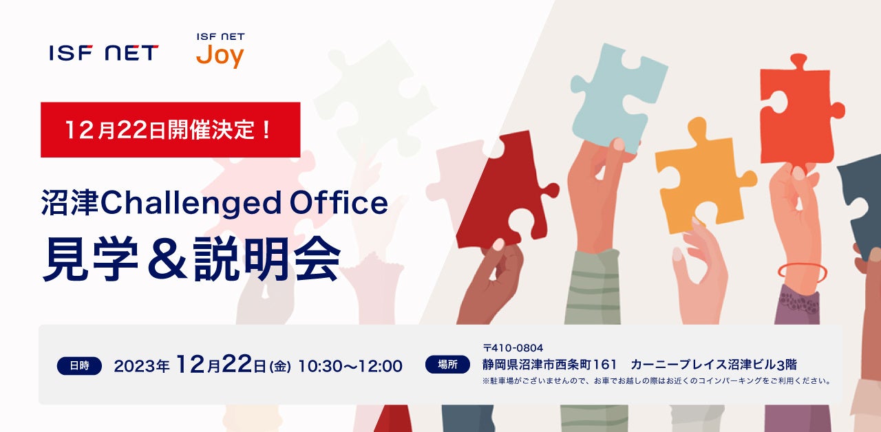 2023年12月22日(金)に株式会社アイエスエフネット 沼津支店にて、チャレンジドオフィス見学&説明会を開催し、障がい者雇用のポイントや課題についてご説明します。