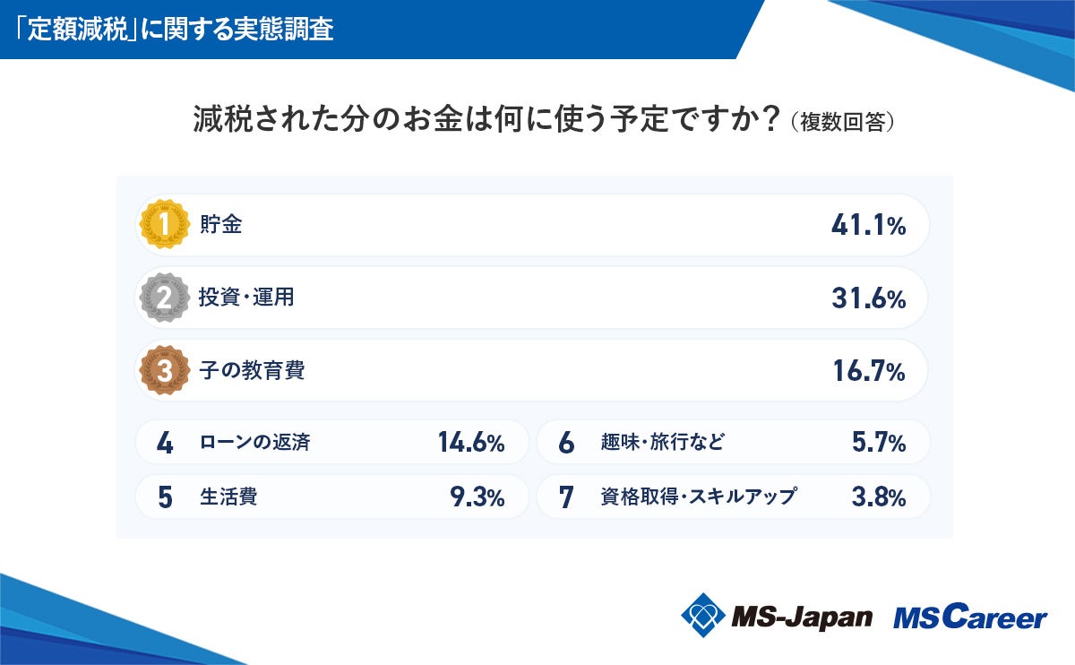続いて、「減税された分のお金の使い道」についても調査を実施。1位は「貯金」、2位は「投資・運用」という結果になりました。「趣味・旅行など」の娯楽での使用はわずか5.7%であり、減税分のお金の使用については保守的な姿勢が明らかになりました。