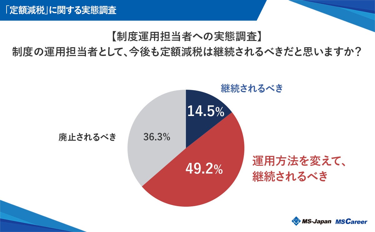 定額減税の制度運用担当者に対しても、定額減税継続の是非について調査を行ったところ、「継続」に賛成派は63.7%と半数以上を占めたものの、うち49.2%は「運用方法を変えて継続されるべき」と回答する結果に。運用方法には改善の余地があると多くの担当者が感じていることが明らかになりました。
