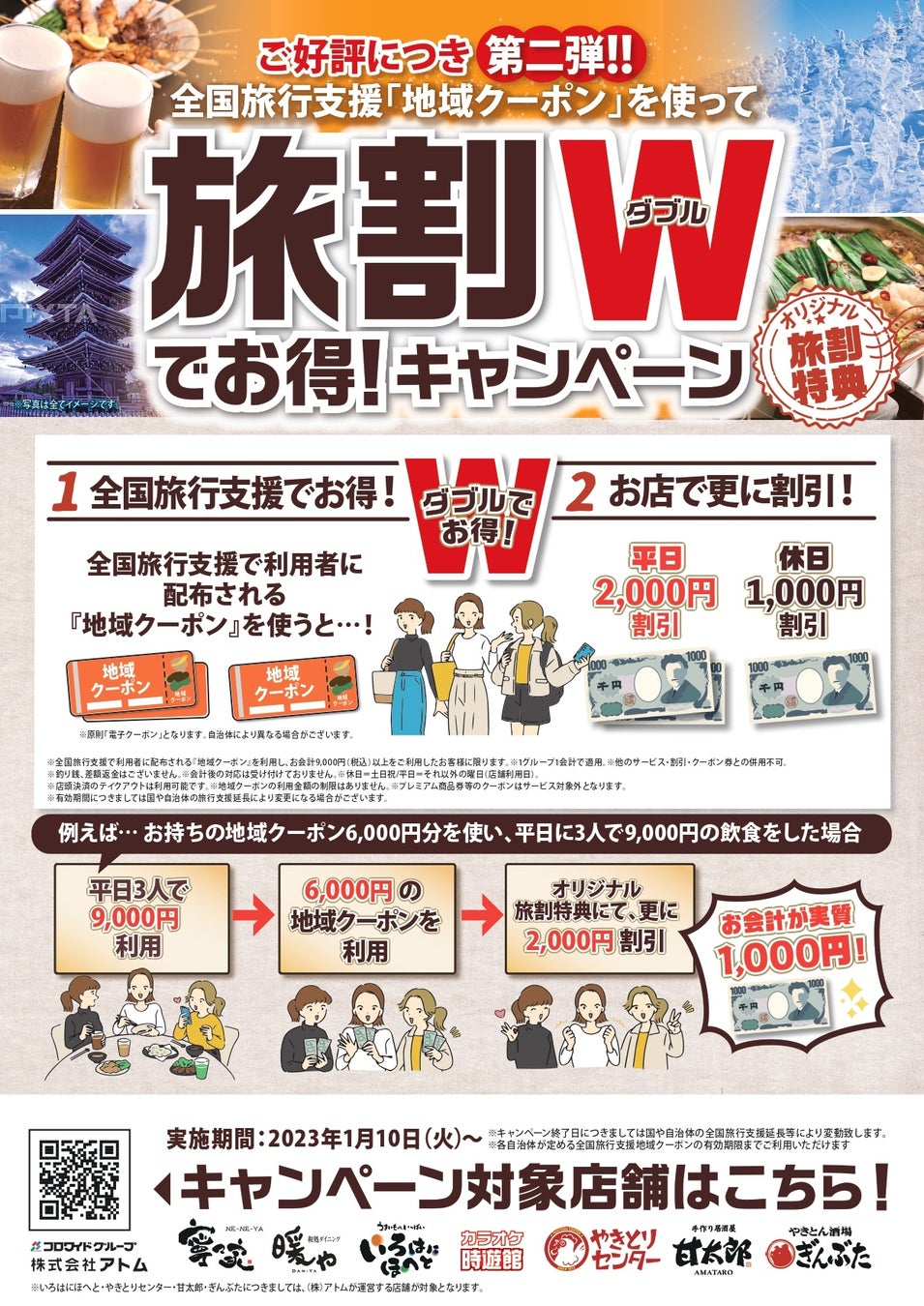 コロワイドグループの株式会社アトム(本社:神奈川県横浜市、代表取締役社長:山角豪)は居酒屋「寧々家(ねねや)」、「暖や」、「いろはにほへと」、「やきとりセンター」、「甘太郎」、「ぎんぶた」、「時遊館(じゆうかん)」の対象店舗で、2023年1月10日(火)より全国旅行支援地域クーポンご利用のお客様を対象に「旅割 Wでお得!キャンペーン 第二弾」を実施しております。