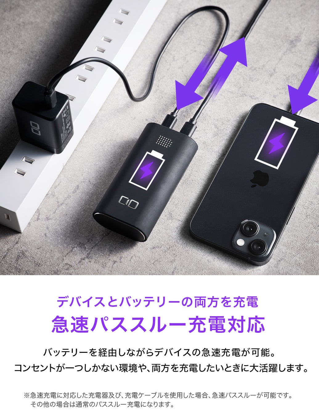 モバイルバッテリーの充電し忘れで、使いたい時にバッテリーが空になっている事も。本製品は画期的な急速パススルー充電機能を搭載しており、デバイス、モバイルバッテリー、両方の残量が少なくなってもバッテリーを経由しながら急速充電が可能です。コンセントが1つしかない環境や、両方を充電したときに重宝します。