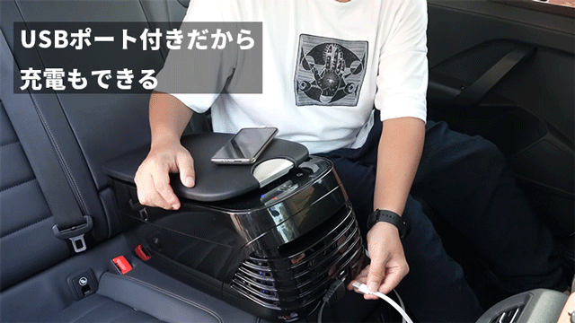 ドリンクホルダーとUSB充電ポート付きで移動時間もっと便利に。45dBと静音で気になりません。