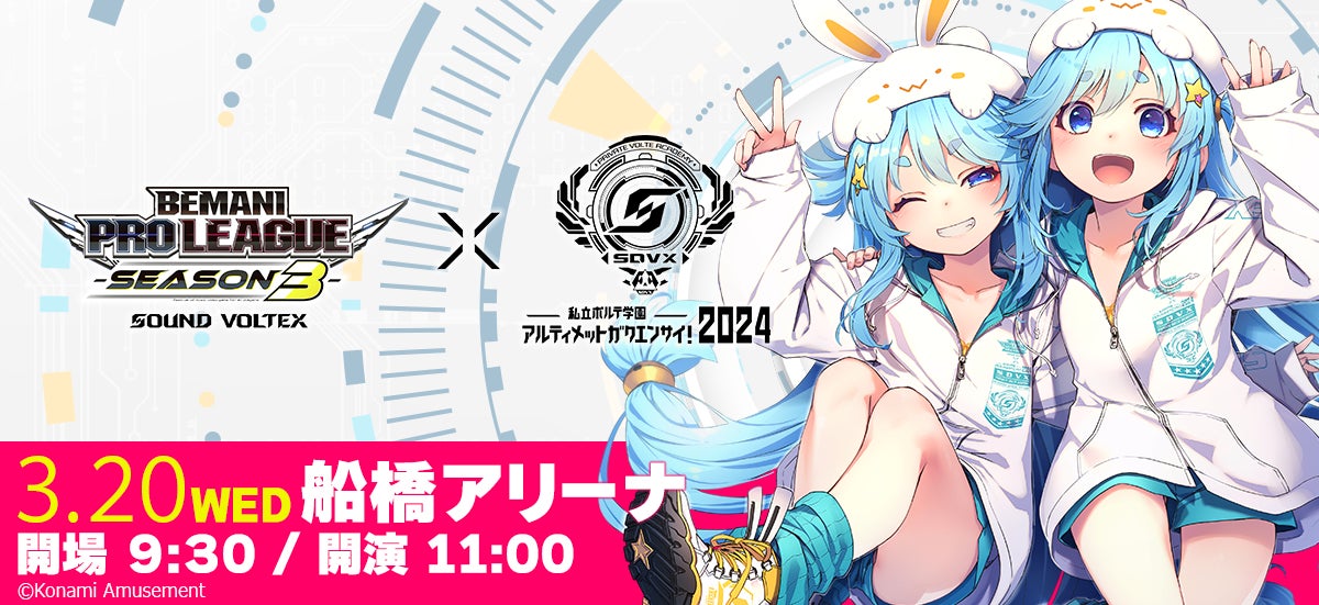 株式会社コナミアミューズメントは株式会社EMPと共催で『BEMANI PRO LEAGUE -SEASON 3- SOUND VOLTEX セミファイナル・ファイナル × 私立ボルテ学園アルティメットガクエンサイ!2024(ビーマニプロリーグ シーズンスリー サウンドボルテックス セミファイナル・ファイナル カケル シリツボルテガクエンアルティメットガクエンサイ!ニセンニジュウヨン)』を3月20日(水・祝)に船橋アリーナ(千葉県・船橋市)で開催することをお知らせします。
