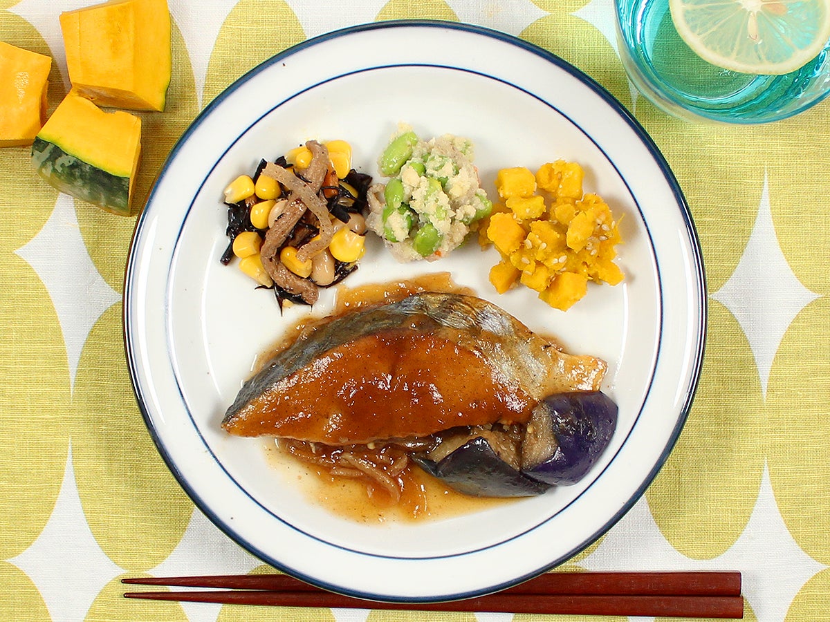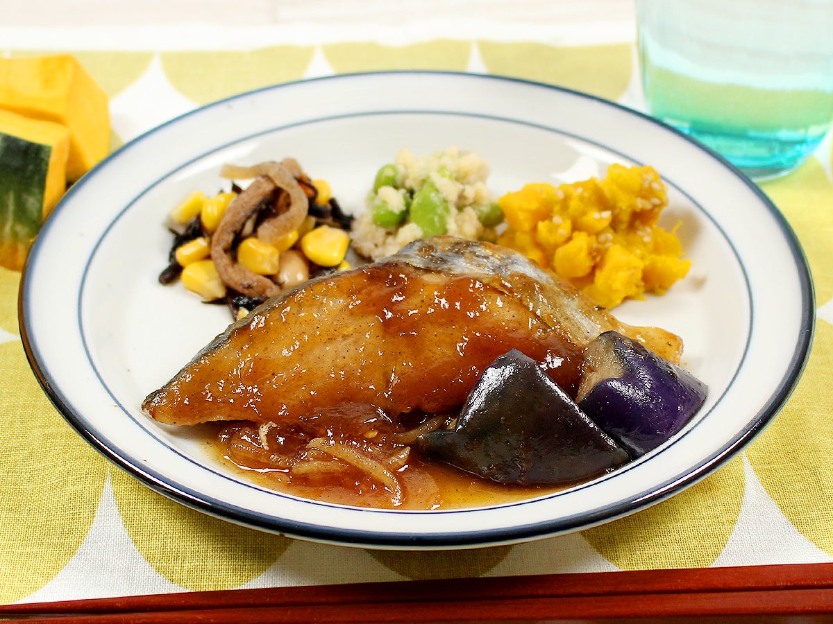 さわらをふっくらと焼き、甘辛い醤油ベースの山椒あんにほんのり梅の香るソースをかけました。大根の千切りと揚げ茄子を添えてあります。