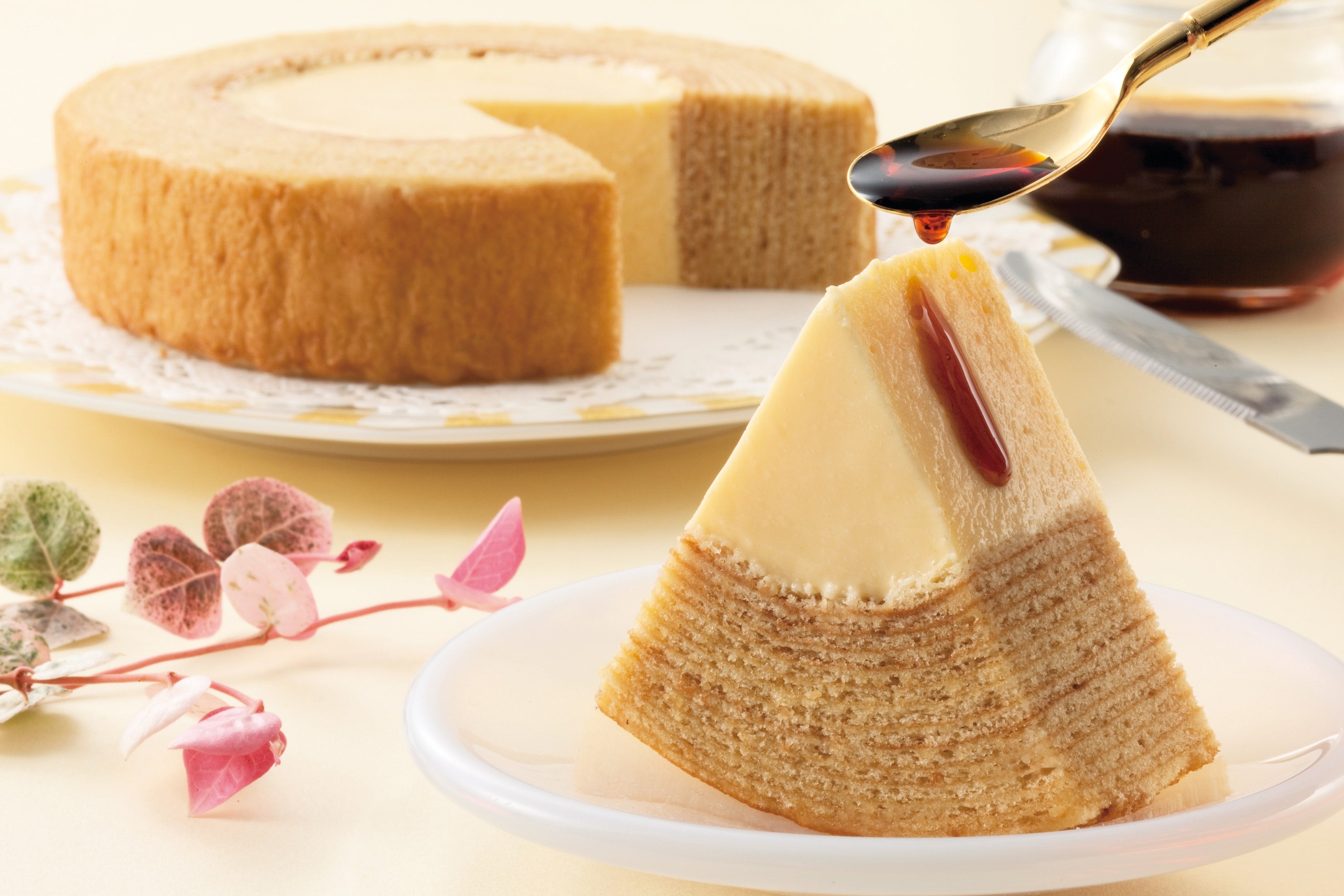香り高いカフェインレスコーヒーを生地に練りこんだカフェラテバウムに、イチゴのピューレと生クリームをたっぷり加えた見た目も可愛らしいバウムクーヘン。