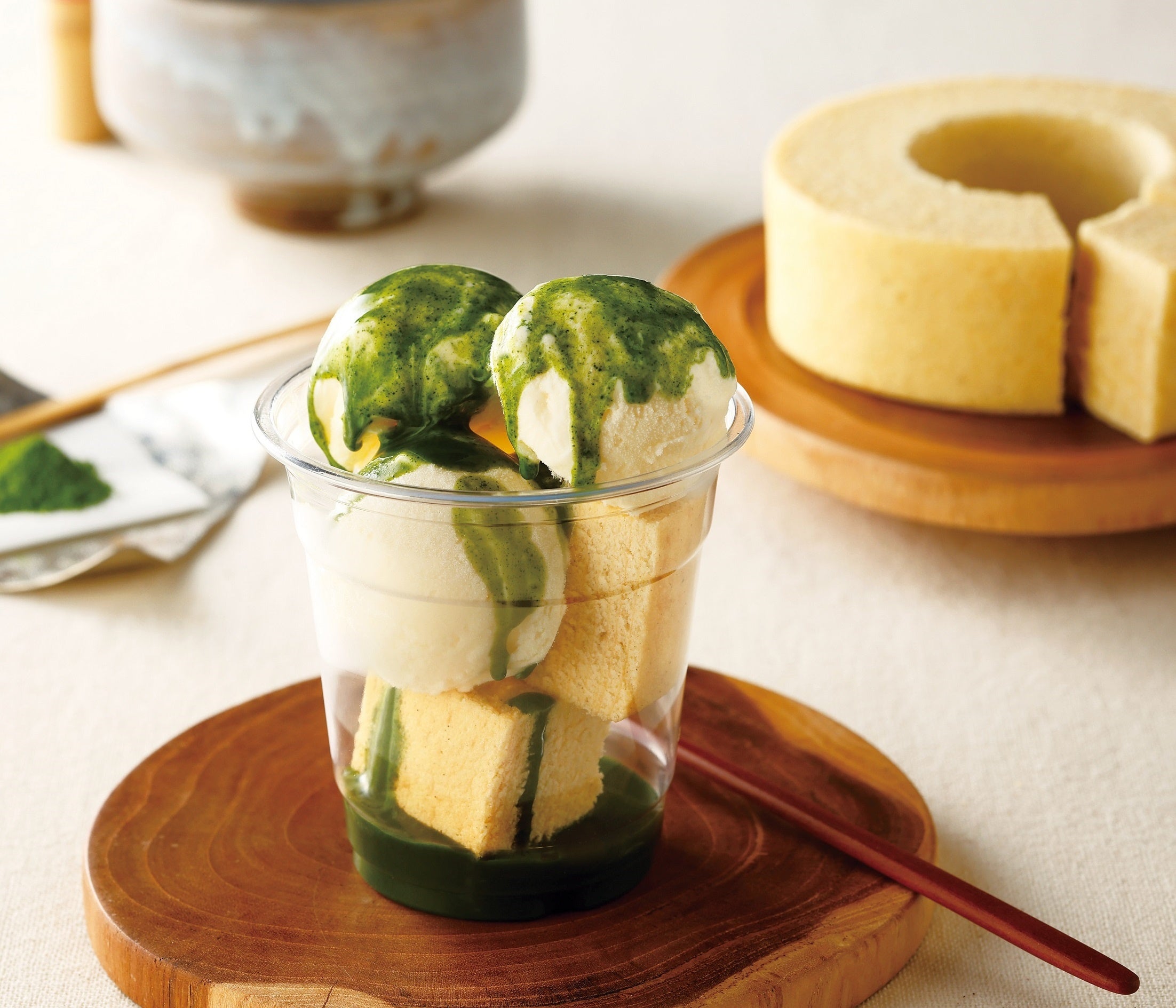 バウムクーヘン専用AIオーブン「THEO(テオ)」で焼き上げたバウムクーヘンとなめらかなジェラートを合わせ、点てたての抹茶をかけて提供します。