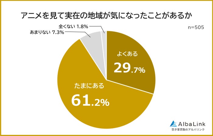 今回、株式会社AlbaLink( https://albalink.co.jp/)が運営する訳あり物件買取ナビ( https://albalink.co.jp/realestate/)は、アニメが好きな505人を対象に「アニメの聖地で住んでみたい地域」についてアンケート調査を実施しました。