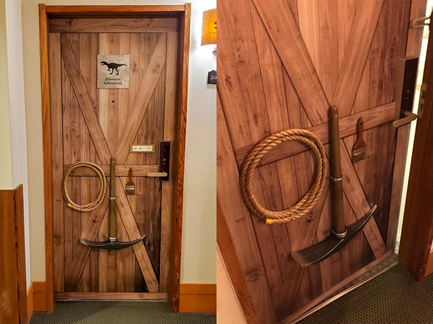恐⻯ラボ(研究室)ルームは、客室入口にお客様専用のネームプレートを設置します。また骨格全⻑に従いカットアウトされた全5体の恐⻯型が、発掘された地層をイメージした壁紙に配置されています。研究者になりきるための部屋着の貸し出もしていますので、恐⻯博⼠になりきって、太古の世界を体感ください。