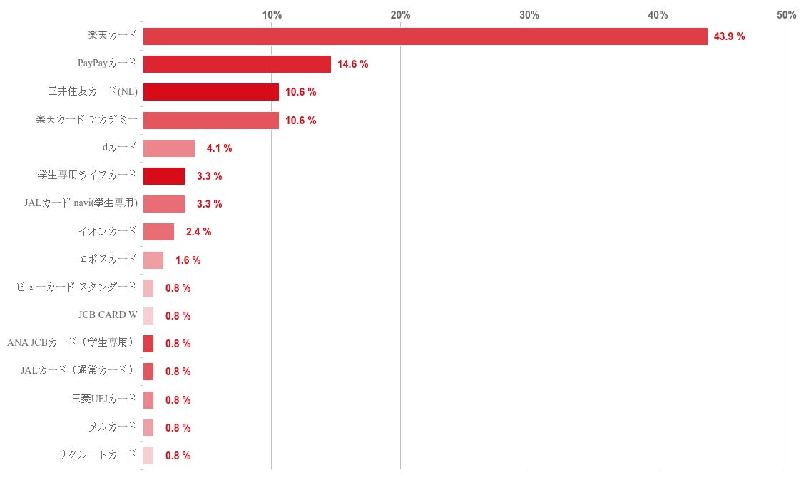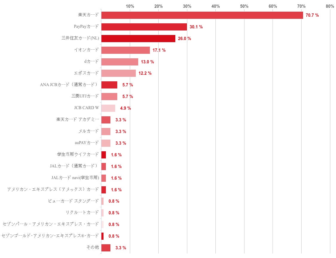 楽天カードが33.3%で最も多く、三井住友カード(NL)が18.7%でこれに続いた。また、JCB CARD Wが8.1%で3番目に多かった。