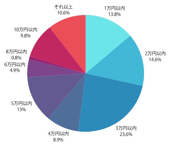 学生のクレジットカードの毎月の利用額は、「3万円以内」が23.6%で最も多く、「2万円以内」が14.6%と次に続いた。また、「1万円以内」も13.8%と3番目に多かった。