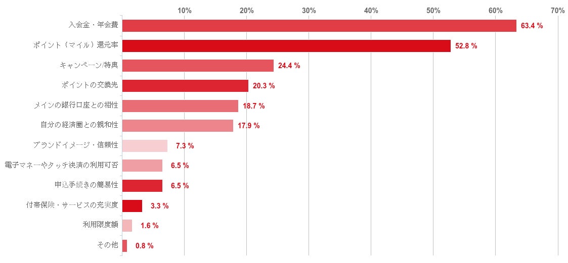 「入会金・年会費」、および「ポイント(マイル)還元率」、を重視している人が圧倒的多数という結果になった。なお、その他には「キャンペーン・特典」や「ポイントの交換先」を選ぶ人も多かった。