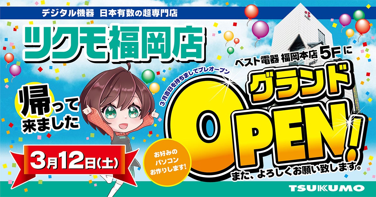 株式会社ヤマダデンキ(本社:群馬県高崎市、代表取締役社長:小林辰夫)は、パソコンおよびパソコン周辺機器を販売するTSUKUMO(ツクモ)ブランドにおいて、ツクモ博多店を現在の店舗から移転、福岡県福岡市天神のベスト電器福岡本店内にパソコン専門店「ツクモ福岡店」として名称を変更し移転オープンするとともに、2022年3月12日(土)より記念特価セールを開催いたします。